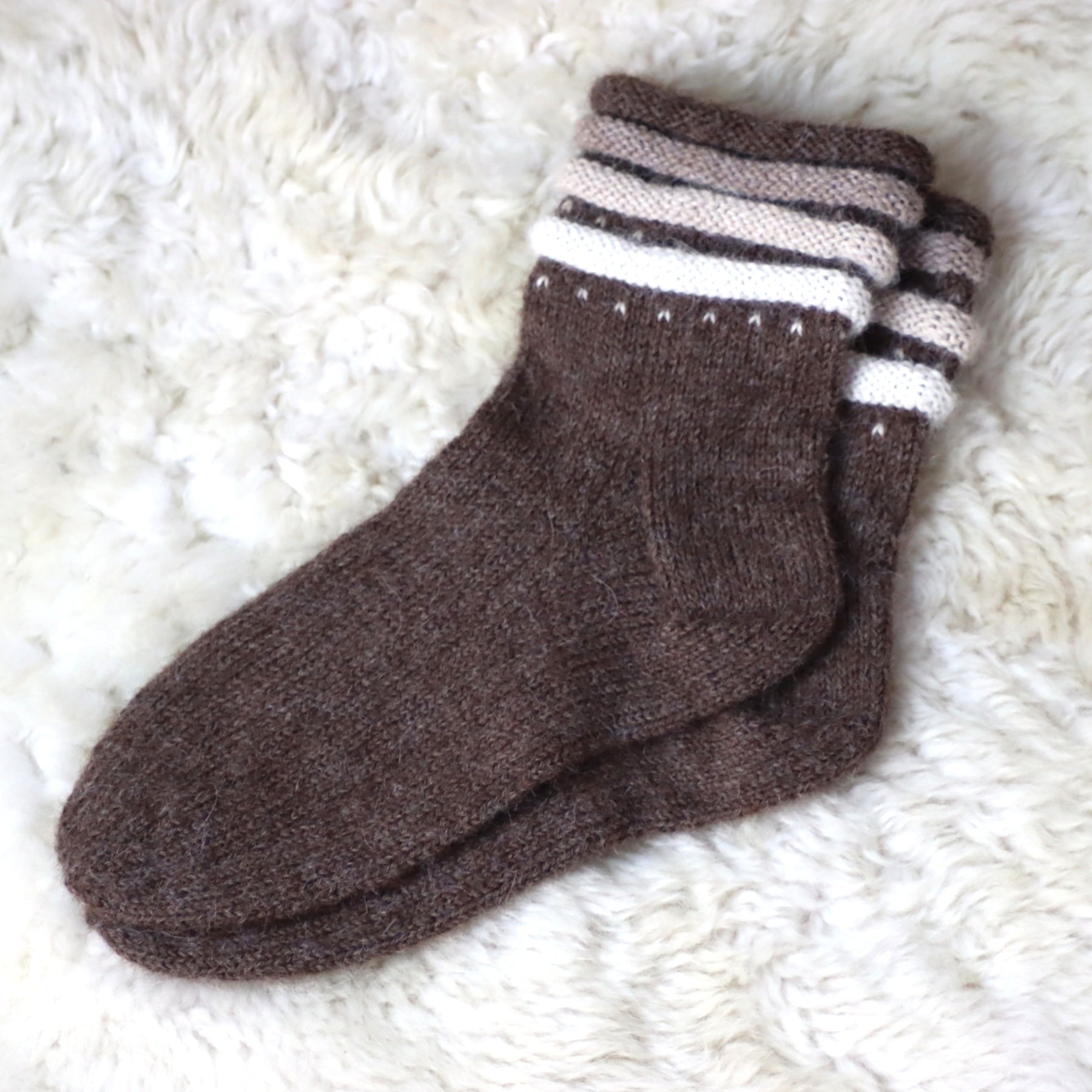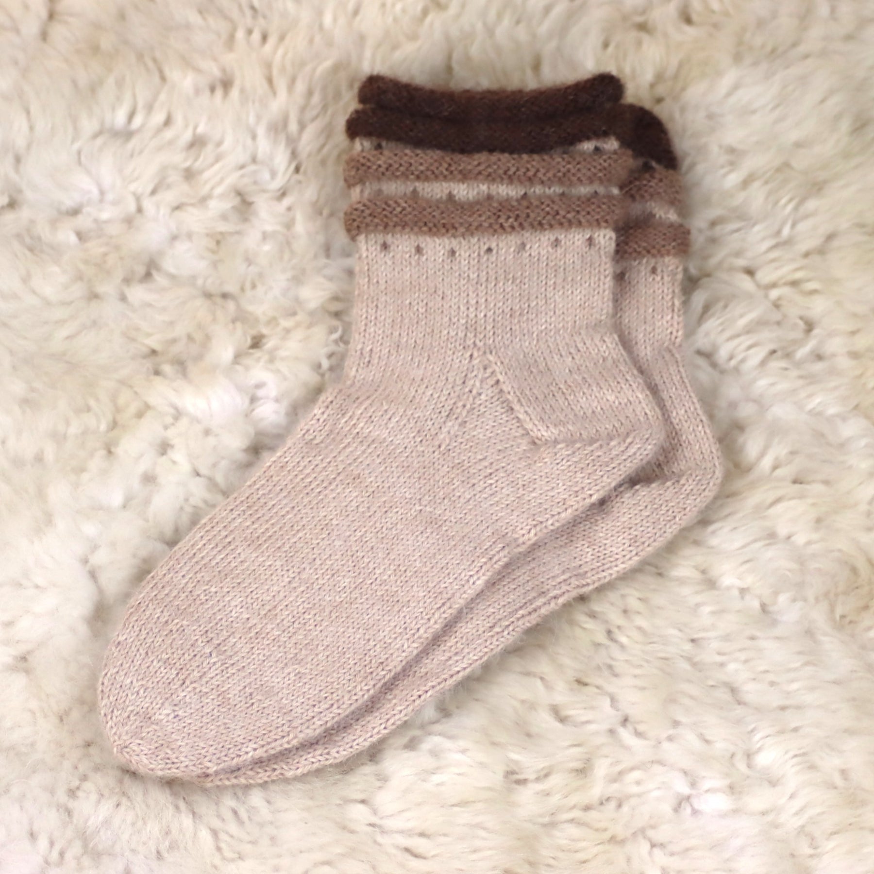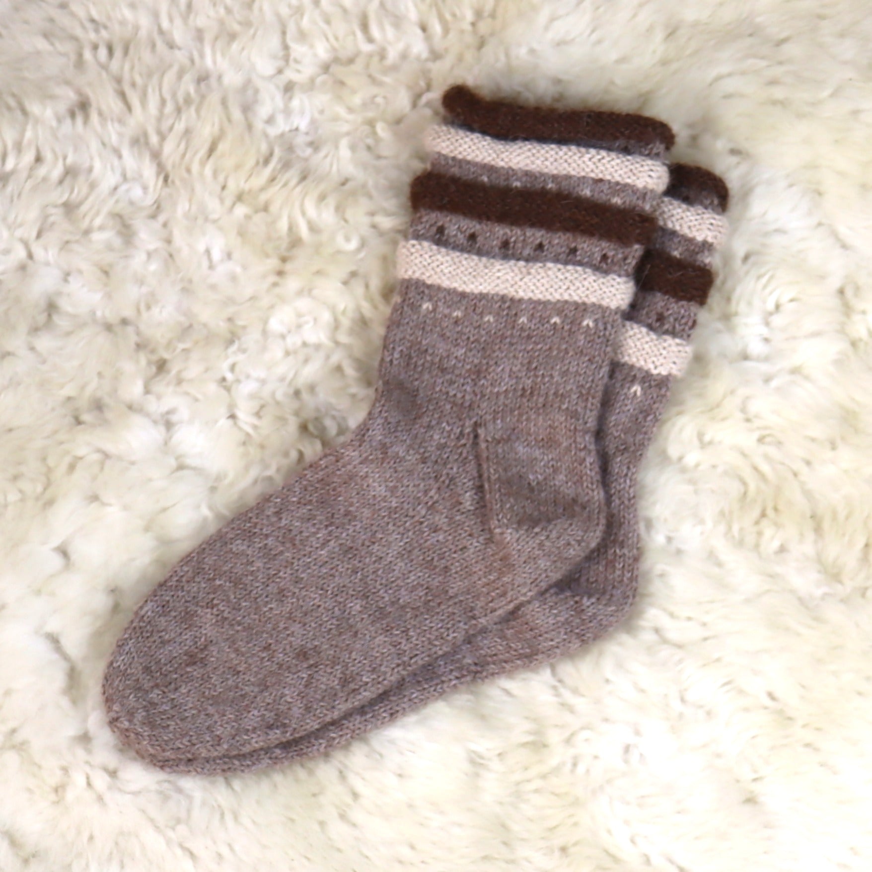 Erilise äärega soojad käsitsi kootud alpakavillased sokid.