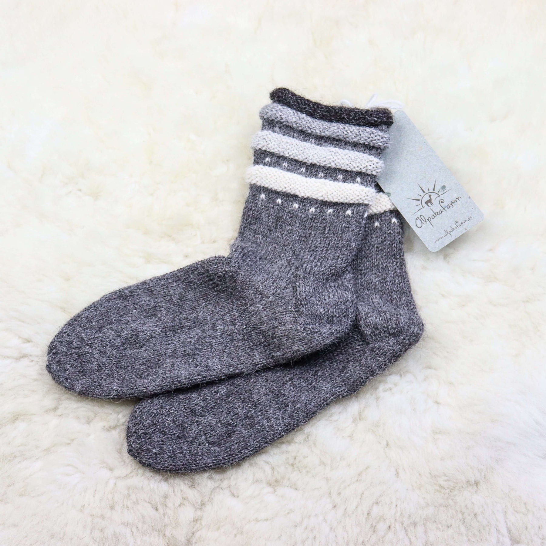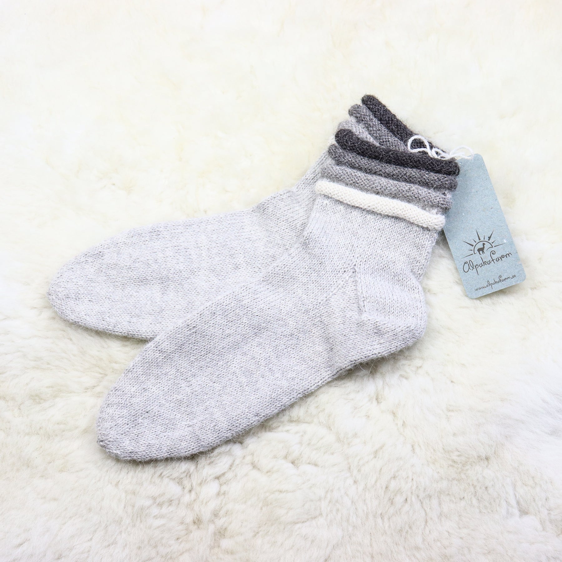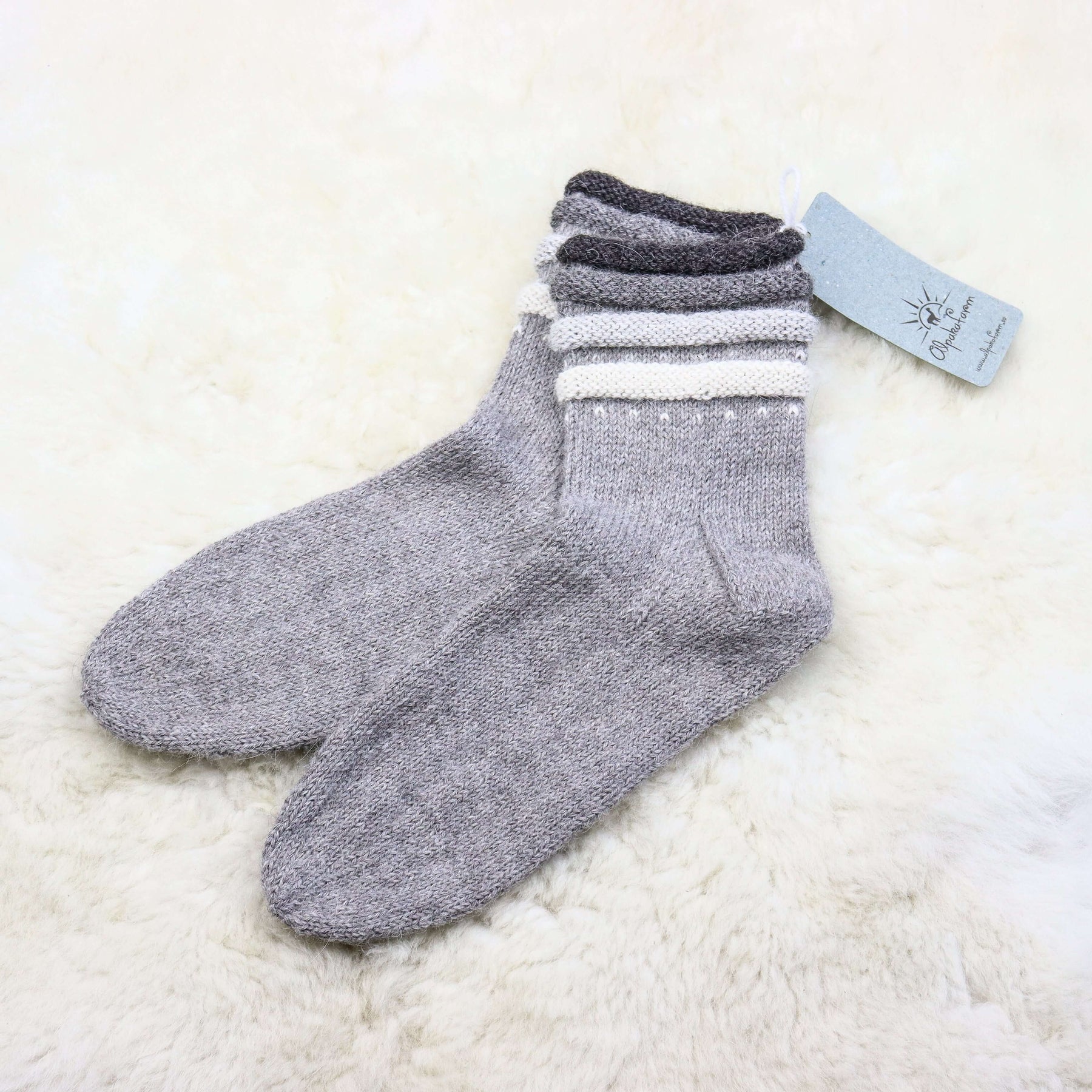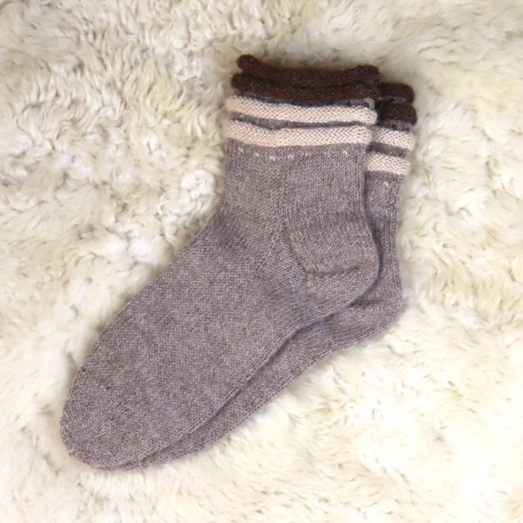 Erilise äärega soojad käsitsi kootud alpakavillased sokid.